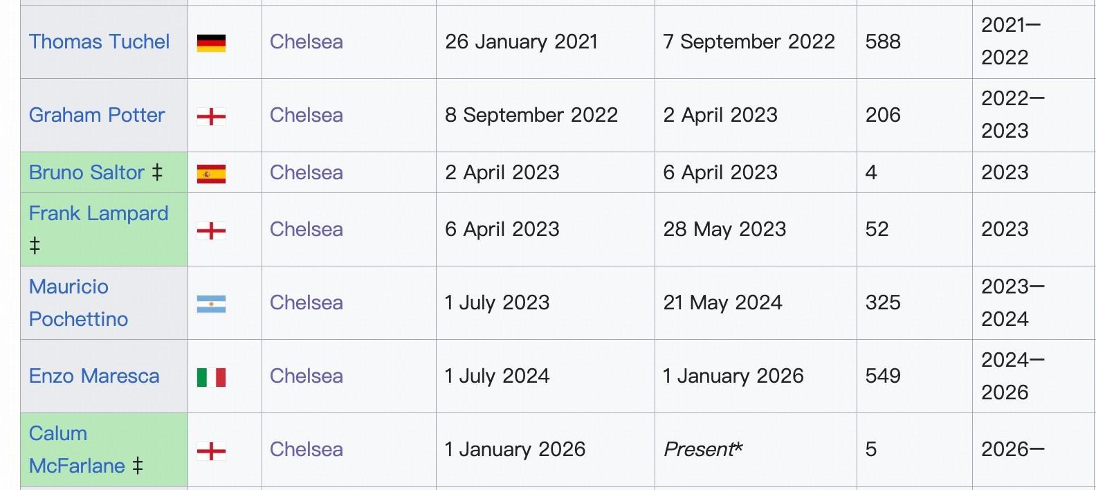 在任时间5天,战绩为1平,胜率0%,据悉麦克法兰还将指挥切尔西客战富勒姆的比赛